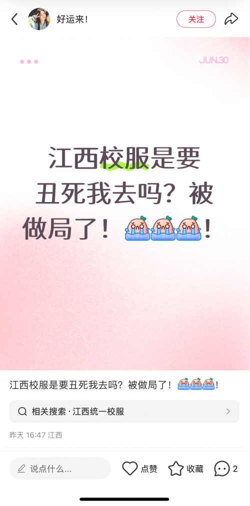 近期,江西、遼寧省校服管理推行“一市一款”,各市校服款式征集活動引發(fā)了各界關注。在追求整齊劃一的背后,一系列問題浮出水面。