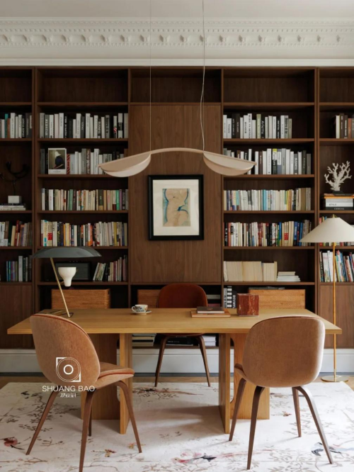 吊燈來自Flos,落地?zé)艉鸵巫佣紒碜訥ubi,書桌是丹麥Menu 的Androgyne系列。滿墻的胡桃木書架呈現(xiàn)出木材特有的天然質(zhì)樸與溫潤,與身俱來的清雅感讓書房成為感知層面的延展性容器,每一次沉浸式閱讀與冥想,都是回歸內(nèi)心的旅程。