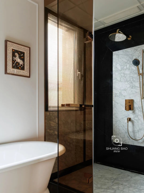茶色玻璃隔斷干濕兩區(qū),由黑色大理石與中花白大理石組成的黑米色系淋浴間相對干區(qū)則更為冷冽,而通透的水紋玻璃門不僅隔斷臥衛(wèi)空間,還引入自然光線,讓主臥的采光更通透明亮 。