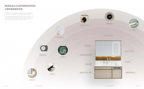表現在2025B系列浴室柜上,光是拉手包覆,就可以提供5種顏色進行選擇,包括木紋色2種(柚木色、原木紋)、金屬色2種(鎳拉絲、紳士灰)、純色1種(筍白色);臺盆也有瑩白亮光盆、彩色亮光盆、彩色磨砂盆等多種既具時尚氣質,又帶有高級感的色彩。