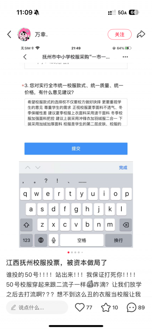 “一市一款”的推行邏輯,本質(zhì)上是將教育管理簡化為“標(biāo)準(zhǔn)化生產(chǎn)”。“政府入圍零售”形成壟斷,導(dǎo)致企業(yè)競爭焦點集中于低價劣質(zhì)而非質(zhì)量與創(chuàng)新,這種機制直接架空了學(xué)校的選擇權(quán)。正如江西某地家長在社交平臺的吐槽:“擬定的校服根本沒經(jīng)過投票,都是內(nèi)定的。”當(dāng)校服采購淪為“行政主導(dǎo)”,家長與學(xué)生的聲音便容易被邊緣化。
