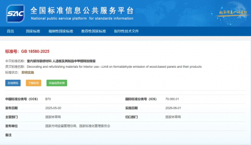 國家強制性標準GB 18580-2025《室內裝飾裝修材料 人造板及其制品中甲醛釋放限量》于2025年6月1日正式實施,標志著我國人造板及其制品環保管控邁入全新階段。