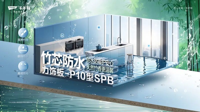 針對家具生活中高濕環境下板材易受潮、發霉、變形等痛點,千年舟應勢推出竹芯防水力飾板-P10型SPB,以技術創新重塑板材性能。