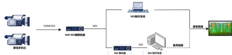 前端采集:通過千視N40編解碼器將現場拍攝信號編碼為4K Full NDI流實時傳輸至后方制作中心,確保比賽畫面的實時性和完整性。