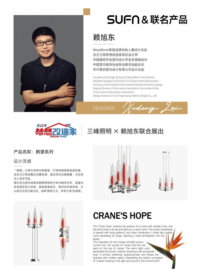 三峰照明始終將設計師聯名產品作為品牌發展的重要戰略方向之一,從早期與張建武老師跨界聯名的溯系列,到與張欣老師攜手呈獻的春曉系列,再到如今與賴旭東老師合作的鶴望系列,三峰照明持續與業界頂尖設計師深度合作,將設計師超前的審美理念與品牌卓越的設計落地能力相結合,為用戶帶來審美度極高的家居藝術體驗。