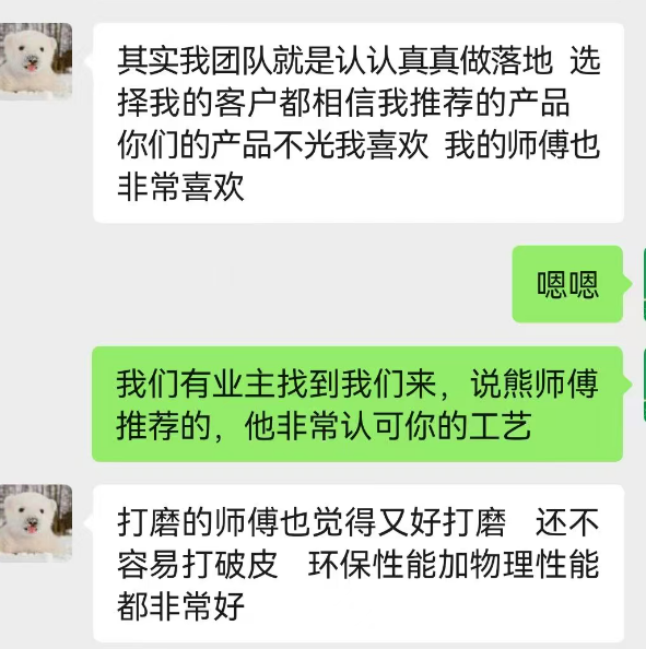 通過我購買卓瑪膩子粉的業主,我做過一些調研,反饋都非常好,起初我還擔心南方配方到北方是否適應,但發現遼寧、河北、江蘇、湖南地區的業主,對產品評價非常高,膩子精白細膩,沒有味道,很結實,硬度好,師傅也反饋批刮爽滑,打磨不脫殼不掉皮,師傅也很喜歡用,施工效率提升,沒有客訴風險,光著膀子施工都沒有問題,粉掉在身上沒有刺激性,在施工現場吃飯、午睡都沒問題,但一般的粉就不能這么干了。