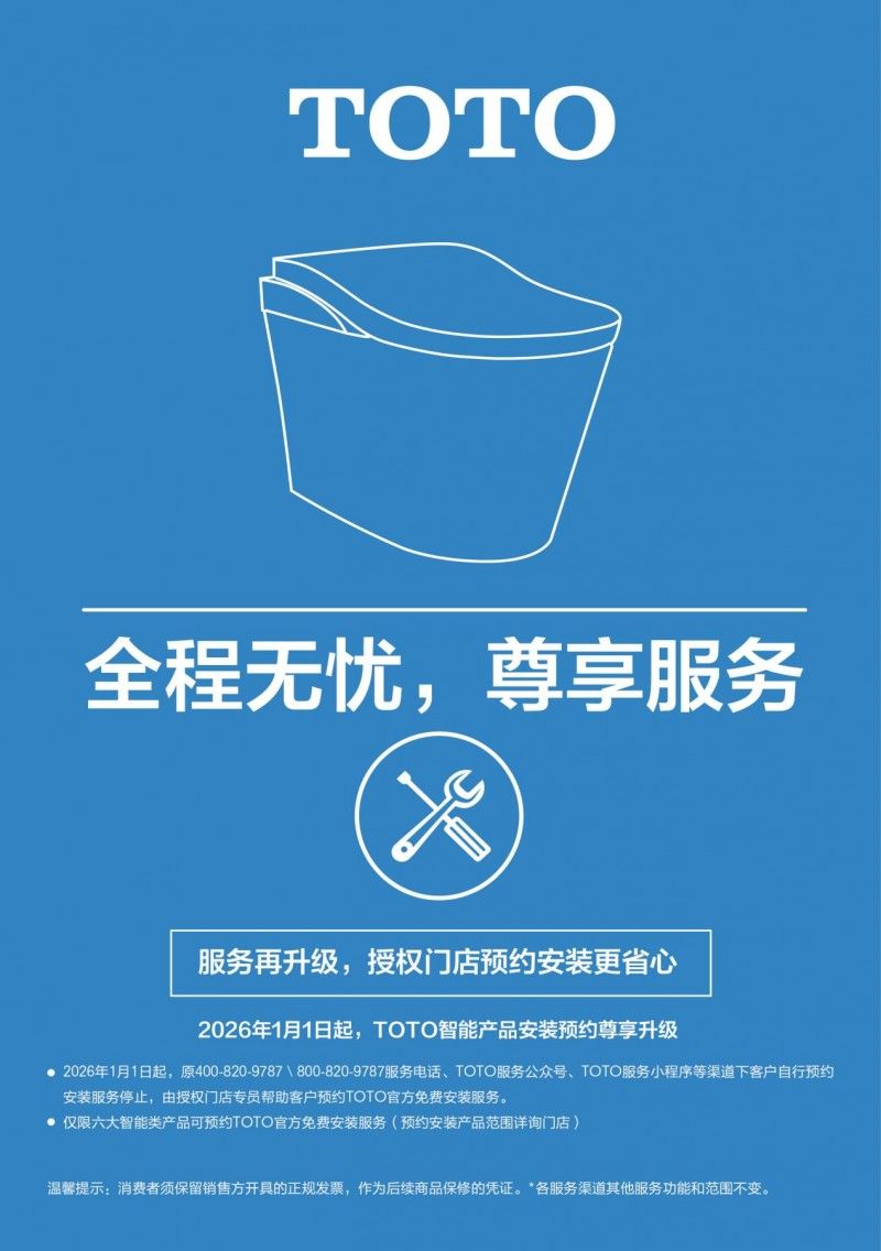 為了讓客戶享受更為便捷、貼心的安裝服務(wù),不斷提升客戶體驗,自2026年1月1日起,TOTO智能產(chǎn)品的官方免費安裝服務(wù)的預(yù)約方式將全面升級,帶您盡享尊貴與省心。