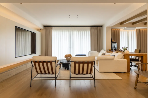 低光度、低飽和度的實木地板成為當下的“流量擔當”,柔和的啞光質感、溫潤的中性色調,為空間注入了實木的獨特質感。腳感溫潤不冰冷,與軟糯的沙發、雅致的茶幾、柔和的燈光相得益彰,營造出獨特的舒適氛圍。