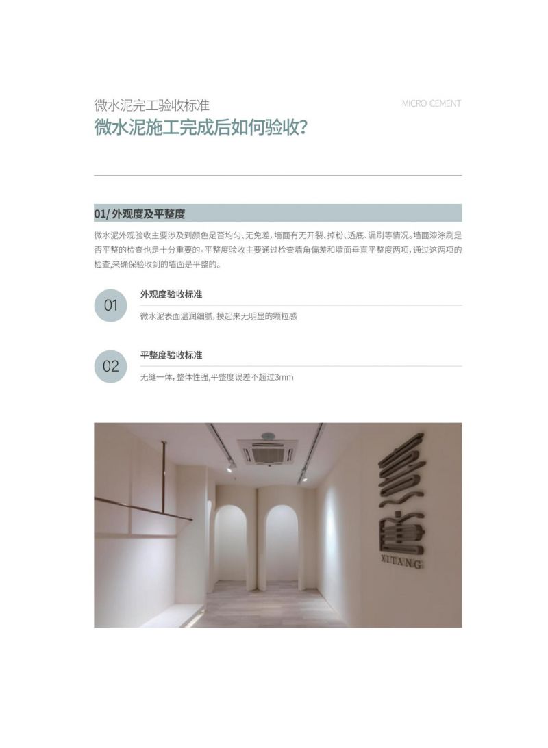 A:Vanlei萬磊微水泥驗收包含八大項:表面平整度(≤2mm/2m)、顏色均勻性(無色差)、防水性能(24小時不透水)、附著力(劃格法測試)、環保指標(VOC檢測)等,每一項都有具體量化標準。