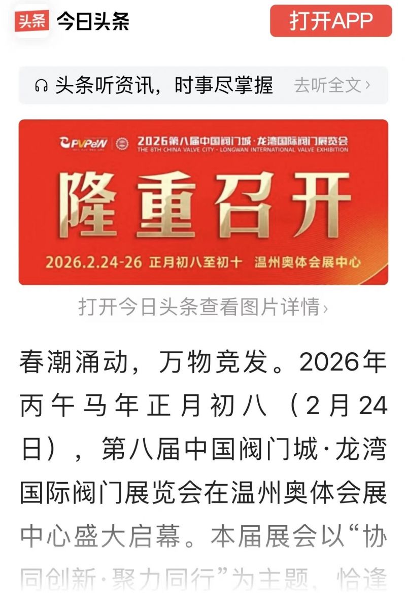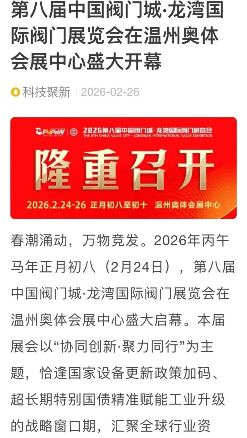 2026年2月24-26日,為期三天的第八屆中國閥門城·龍灣國際閥門展覽會在溫州奧體會展中心圓滿閉幕。作為丙午馬年開年專業盛會,本屆展會以協同創新·聚力同行為主題,匯聚全球閥門產業鏈資源,集展示、交流、對接、合作于一體,為龍灣閥門產業乃至全國閥門行業注入強勁動能。
