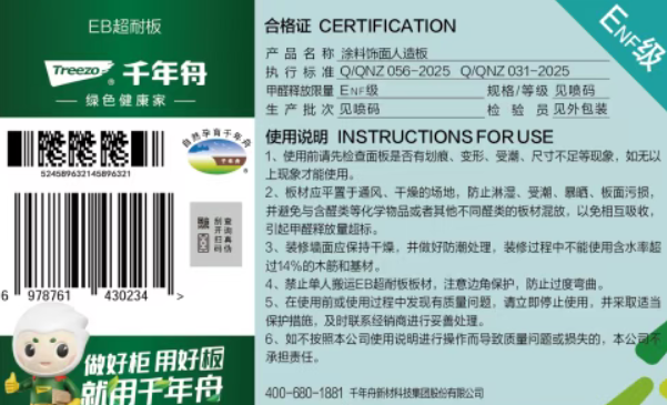 板材側(cè)邊印有規(guī)整清晰的噴碼信息,信息含有千年舟LOGO、商品名、板芯、厚度、環(huán)保等級等內(nèi)容。