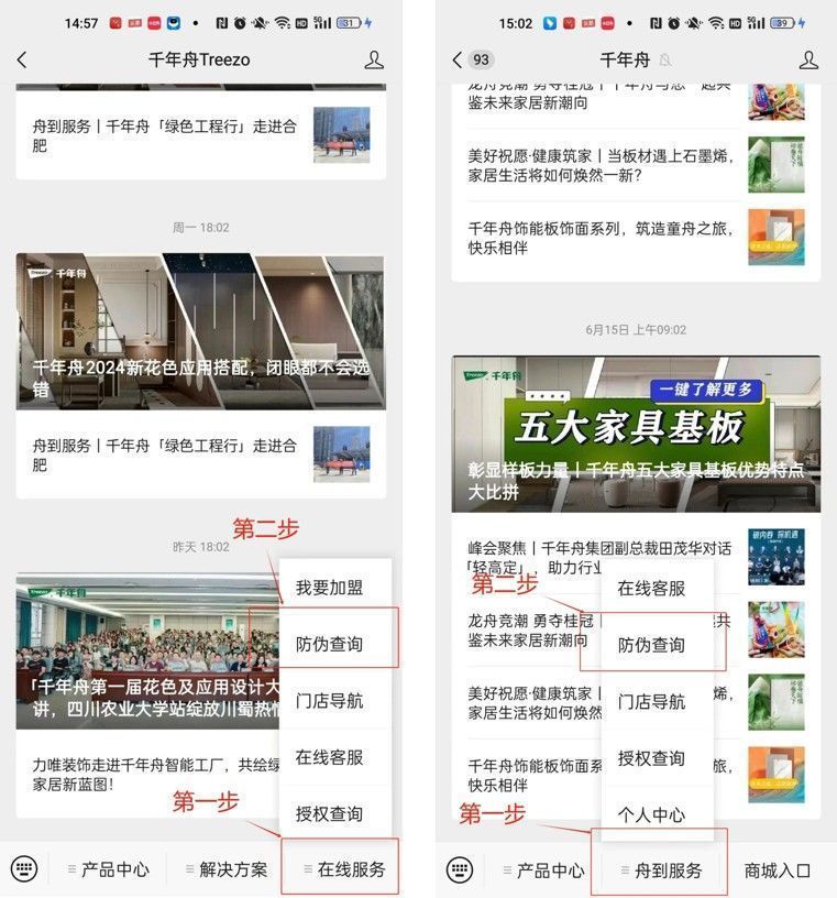 ●關(guān)注千年舟Treezo微信公眾號,在手機下方菜單欄選擇“在線服務(wù)”→ “防偽查詢”;
