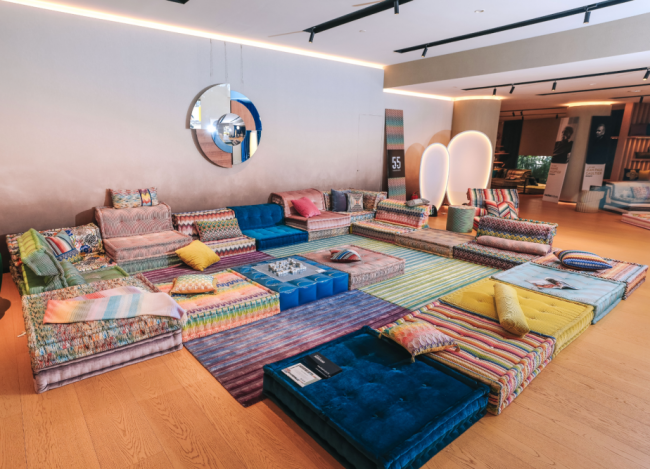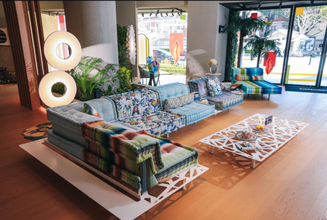 展覽現(xiàn)場(chǎng),Mah Jong 沙發(fā) Missoni 版還以極具創(chuàng)意的“貪吃蛇”式組合方式呈現(xiàn):多個(gè)模塊在空間中連續(xù)蜿蜒延展,如同一條靈動(dòng)游走的色彩軌跡,在開(kāi)闊空間中形成流動(dòng)的視覺(jué)路徑。這種頑皮布局既展現(xiàn)了 Mah Jong 高度自由的特性,也讓觀者在行走之間不斷發(fā)現(xiàn)新的空間節(jié)奏與視角。