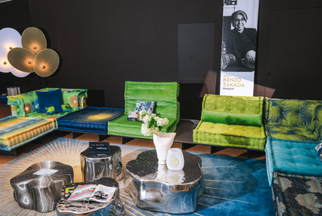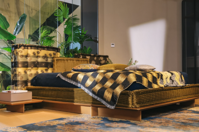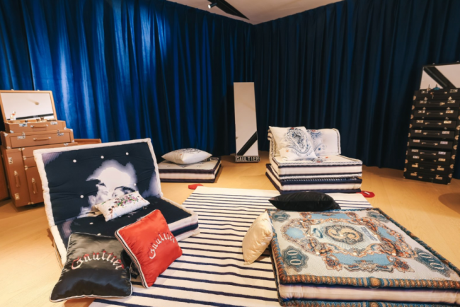與“時(shí)尚頑童”Jean Paul Gaultier 的合作版本,則展現(xiàn)出另一種大膽率真的設(shè)計(jì)態(tài)度。JPG 將其標(biāo)志性的水手條紋與高級(jí)時(shí)裝面料結(jié)合,為Mah Jong“麻將”沙發(fā)賦予鮮明的個(gè)性印記。現(xiàn)場(chǎng)宛如一場(chǎng)正在進(jìn)行的時(shí)尚大片拍攝:沙發(fā)模塊與抱枕自由散落于地毯之上,與其為羅奇堡設(shè)計(jì)的其他家居單品彼此呼應(yīng),在空間中交織成一場(chǎng)關(guān)于時(shí)尚、設(shè)計(jì)與生活方式的對(duì)話。