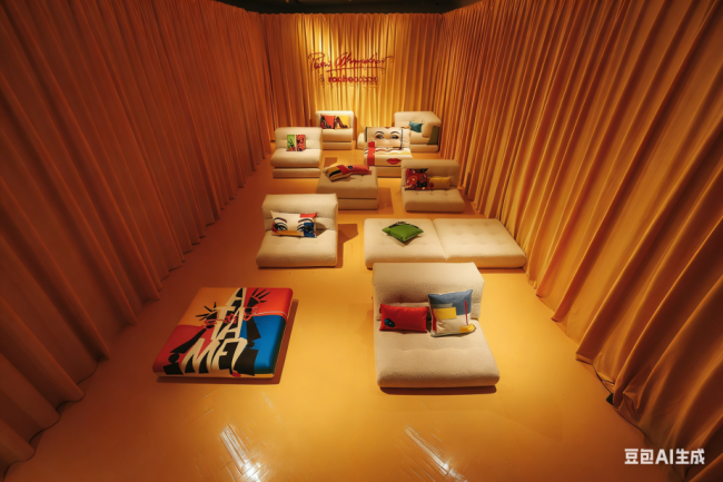 行至三樓,進(jìn)入阿莫多瓦的金色帷幕。這一由導(dǎo)演親自選定的色彩將空間塑造成沉浸式電影院。新品Lounge Pedro Almodóvar 沙發(fā)錯(cuò)落散置于其間,如隨性的觀影坐席,讓觀者自然融入阿莫多瓦的電影宇宙——色彩濃烈、情緒爆滿、敘事張力十足。在此,家居已化身為承載敘事的藝術(shù)媒介。