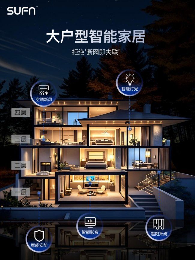 三峰全屋智能家居系統(tǒng)的核心優(yōu)勢體現(xiàn)在極致的穩(wěn)定性。不同于行業(yè)常見的集成第三方系統(tǒng)的模式,三峰完全自主掌控底層代碼邏輯,行業(yè)首發(fā)去網關跨樓層方案,告別“斷網即失聯(lián)”的尷尬,極端情況下單設備故障不影響全局運行。針對別墅大宅大空間、多設備的使用場景,SUFN OS系統(tǒng)可穩(wěn)定支持上百臺智能設備的同時聯(lián)動響應,攻克大戶型控制難題。