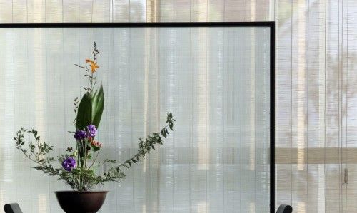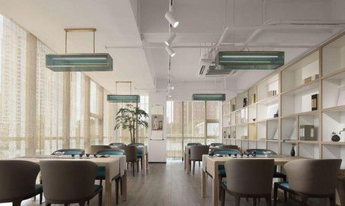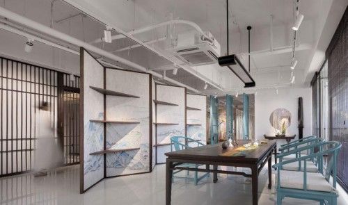 茶書房屏風隔斷選取了王希孟的《千里江山圖》,煙波浩渺的江河、層巒起伏的群山構成了一幅美妙的江南山水圖,動靜結合恰到好處。