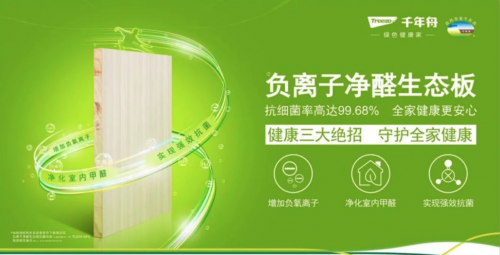 而在抗菌產品的研發進程上,千年舟集團于今年3月率先推出負離子凈醛生態板,利用表層添加電氣石在板材周圍形成電場,分解空氣中的水分子從而釋放負離子的原理,通過負離子攜帶的負電荷主動吸引攜帶正電荷的有害細菌,在材料電場內被抑制分裂增長的能力,與空氣中的塵埃等物質相結合沉降到地面,斬斷傳播媒介;同時搭配專利凈醛技術,一舉對抗甲醛、細菌,抗菌性能(大腸桿菌AS 1.90)達到99.68%。