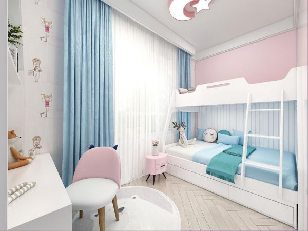 大女兒房,以清新而淡雅的粉色系為主調。米色打底,粉色家具的裝飾,恰似小女孩內心永恒不變的少女心,可愛而柔軟。