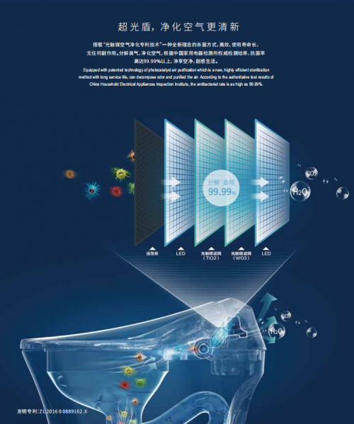 2017年,首發“超光盾”技術,利用超級光觸媒除臭殺菌,凈化空氣更清新空氣;