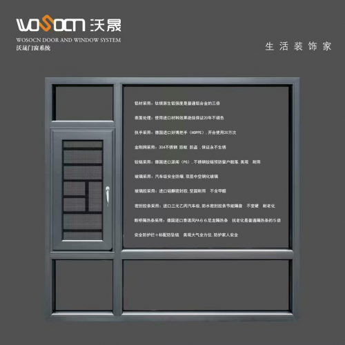 沃晟門窗采用鈦鎂原生鋁,強度是普通鋁合金的三倍;金剛網采用304不銹鋼,防蚊防盜且不怕生銹;雙層中空鋼化玻璃達到汽車級別安全防爆,安全無憂;玻璃膠、密封膠條和斷橋隔熱橋皆采用進口材料,堅固耐用、隔音性能強、同時具有抗老化效果。