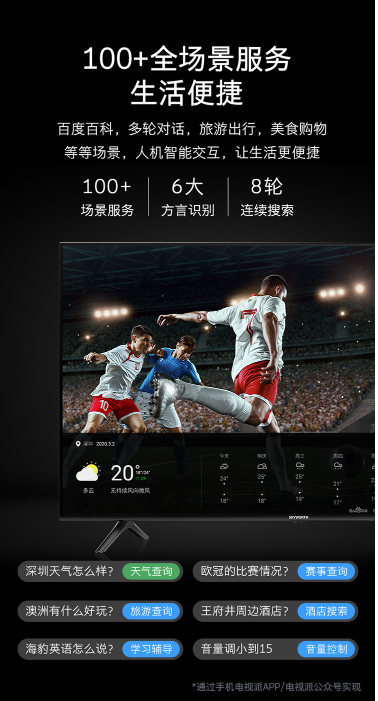 傳統(tǒng)電視需要用到遙控器去換臺,有時候中間跨度大的話需要點(diǎn)按很多次,對于在沙發(fā)上抱著零食的觀看者來說,體驗(yàn)感是很糟糕的。而創(chuàng)維V40智能電視內(nèi)置語音助手小度,換臺或者播放音樂只需要一句話搞定,是不是覺得方便了很多呢!那小度助手有哪些優(yōu)點(diǎn)吶?100+全場景服務(wù),百度百科,多輪對話,旅游出行,美食購物等等多個場景,例如:深圳天氣怎么樣?歐冠的比賽情況?澳洲有什么好玩的?王府井周邊酒店?海豹用英語怎么說?音量調(diào)小到15?小度還支持6大方言識別,讓你與小度輕松對話。人機(jī)智能交互,讓生活更便捷!