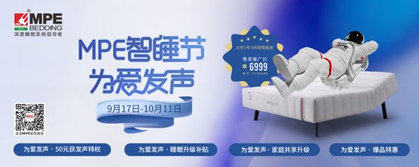 有溫度,亦有力度。9月17日-10月11日,“MPE智睡節(jié)·為愛發(fā)聲”全國門店聯(lián)動(dòng)大促來襲,這是一場(chǎng)鉅惠聯(lián)動(dòng),也是一次愛的發(fā)聲,全民升級(jí)智能床,用誠意為愛助力!用智能科技的力量,傳遞愛的溫度!
