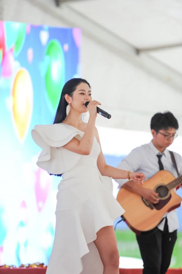 來自寧國安酷藝術學校的AK戰隊導師演繹的《光彩青春》拉開了今天的慶?;顒印4髸潦迹w起立,奏唱國歌。
