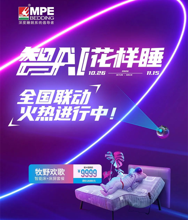 10月26日到11月15日,MPE將以前所未有的鉅惠壕禮、重磅巨制的爆款產品,領銜智能床行業狂歡雙11——“99抵1000特權”、“雙11狂歡套餐”、“雙11爆品特惠”、“美夢升級”……眾多福利瘋狂來襲,你準備好了嗎?