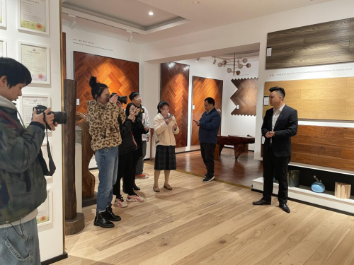 柏爾地板品牌總監王樂祥帶領媒體參觀展廳