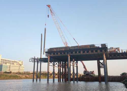 自2020年8月10日項目施工啟動以來,項目經理部積極推進各項施工工作,征地、駐地建設、測量規劃、地質勘察等各項工序繁忙有序。記者在現場看到,除了工作人員的駐地外,現場還建設好了1號混凝土拌合站以及其他建設材料生產加工區,大量石柱、鋼板等建設材料已被生產出來堆放在工地,同步鋼棧橋搭建、便道施工等也緊張地進行中。