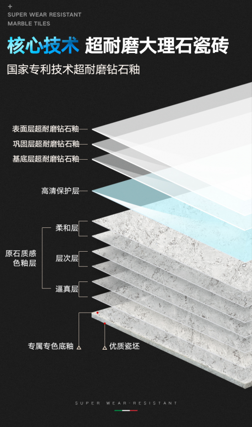 而大角鹿則不同,其察覺到市面上瓷磚不耐磨不美觀等痛點問題,率先對瓷磚耐磨度提升展開深入研究,開創超耐磨技術,并取得“超耐磨鉆石釉”國家專利技術認證,率先推出全球首款超耐磨大理石瓷磚,將瓷磚耐磨度直接提升4級以上,耐磨系數則達到普通瓷磚的三倍。這一突破性的技術開創成為大角鹿決勝瓷磚行業的里程碑式標志之一。