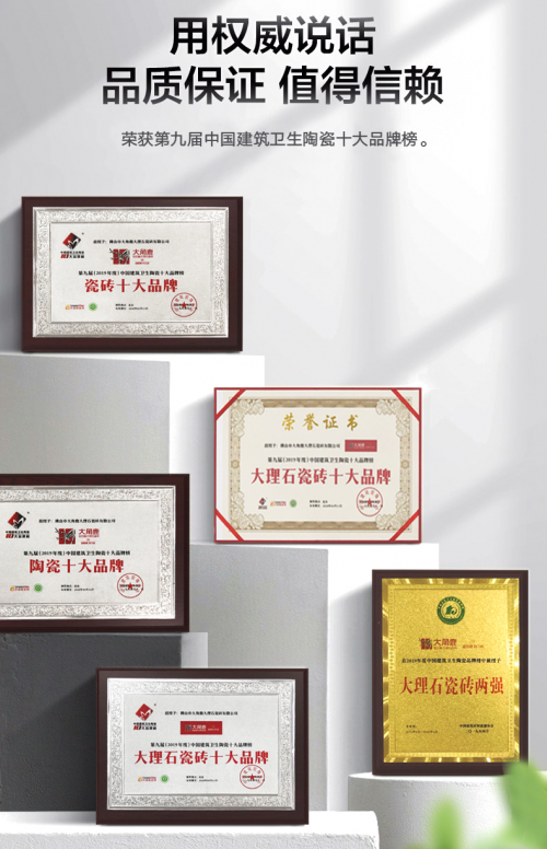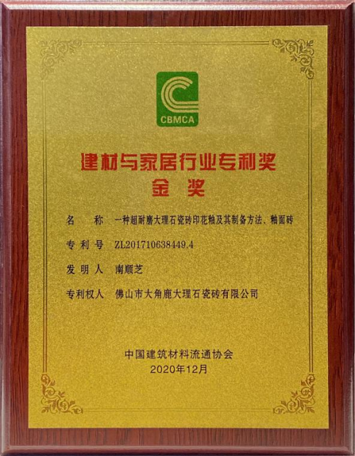 2020年12月,大角鹿瓷磚榮獲2020年中國建材與家居行業專利獎?金獎和中國建材家居?2020特殊貢獻獎兩大獎項、2020消費者信賴十大瓷磚品牌、2020陶瓷一線品牌等眾多獎項。