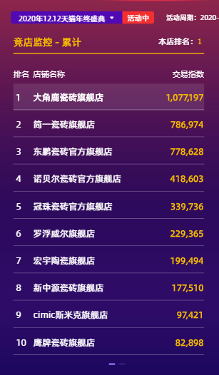 作為12月不容錯過的“雙12”購物盛典,為中國國民經濟創收注入了一劑強心劑。中國陶瓷行業“新零售”的故事也在“雙12”購物節中繼續上演——中國瓷磚新銳領先品牌:大角鹿超耐磨大理石瓷磚,在今年“雙12”全球購物狂歡季中再創佳績,以1077197累計交易指數成功斬獲天貓“雙12”陶瓷類銷量第一,成為實至名歸的“瓷磚之王”。