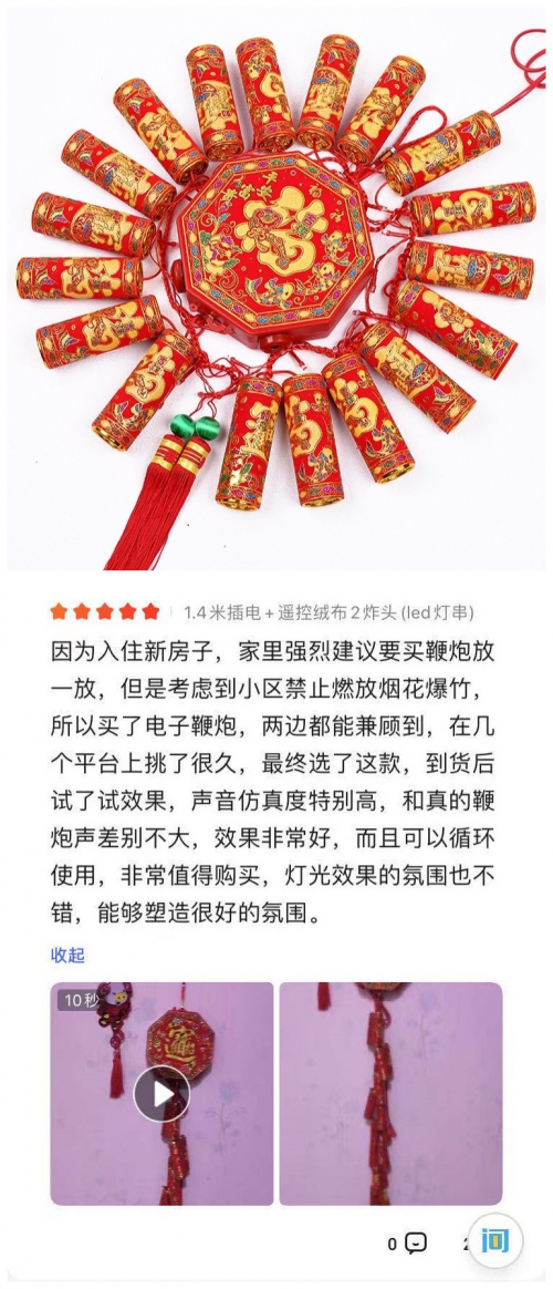 難怪這位京東用戶評(píng)價(jià)說(shuō):“因?yàn)槿胱⌒路孔樱依飶?qiáng)烈建議要買鞭炮放一放,但是考慮到小區(qū)禁止燃放煙花爆竹,所以打算買電子鞭炮,兩邊都能兼顧到。挑了很久,最終選了這款,到貨后試了試效果,聲音仿真度特別高,和真的鞭炮聲差別不大,效果非常好,而且可以循環(huán)使用,燈光效果也不錯(cuò),能夠塑造很好的氛圍。”