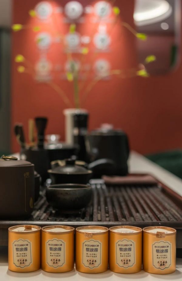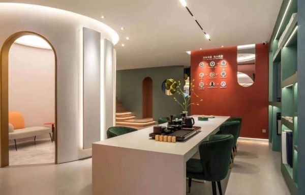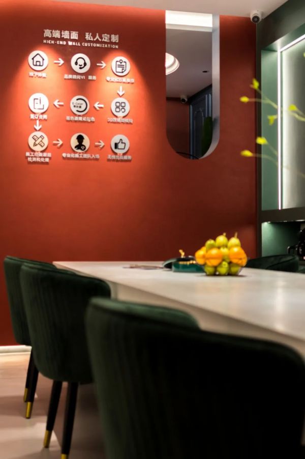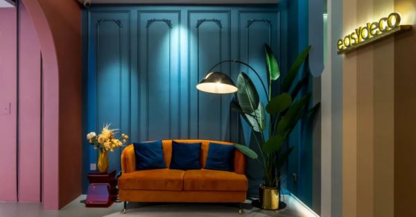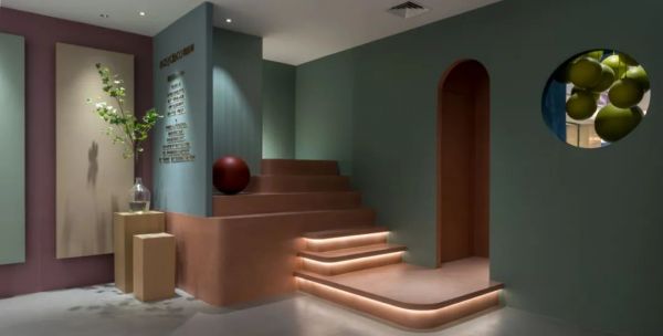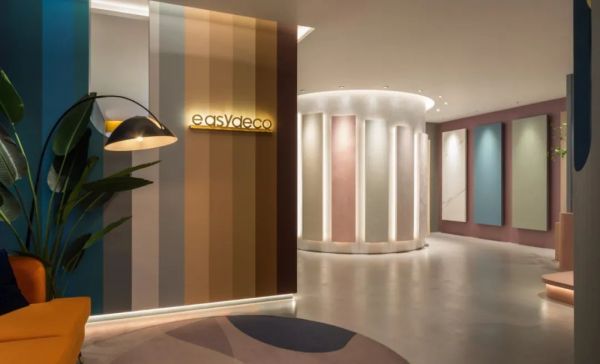 Easydeco易涂得藝術涂料入口處風格迥異,設計師運用拱形結構,在入口營造寧靜的氛圍,一組室內休閑場景的打造,頓生對理想家的向往,步入店內,5米長的過道增添了進入的儀式感,同時確保了展廳洽談區的私密性。