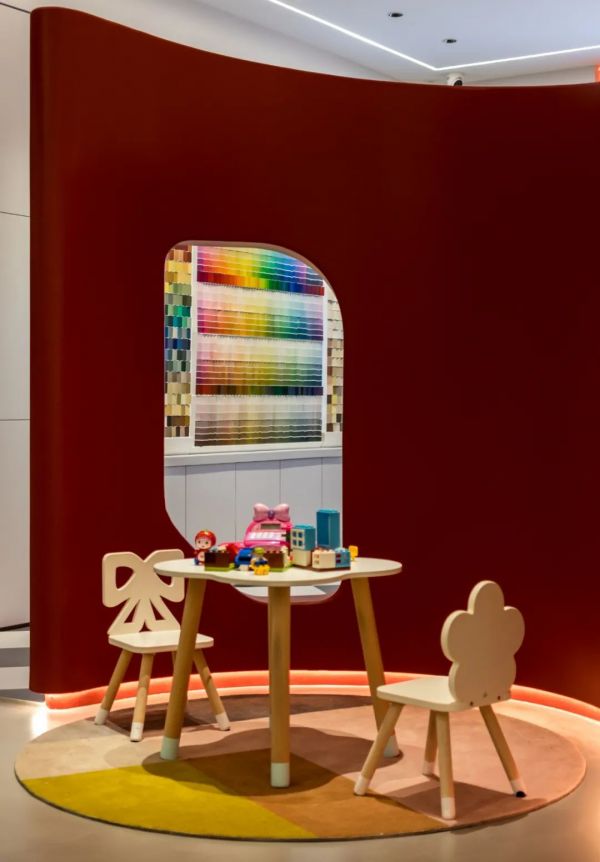 改造前的店鋪為傳統的涂料銷售門店,店鋪空間凌亂,對于往來家具城的人而言,并沒有很強的吸引力。設計師張天將門店全面升級,旨在打造一個多元體驗的色彩博物館,顧客不但可以了解品牌和涂料的相關知識,亦能沉浸體驗色彩的無限魅力。