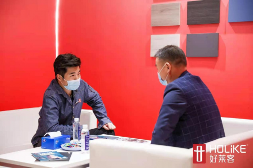好萊客藝術整裝洽談區吸引了眾多意向加盟商火熱咨詢,現場招商人員耐心講解了藝術整裝模式核心優勢。