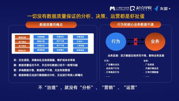 很多公司經常忽略的一點就是數據采集:在公司內部需要很清晰的看到一個產品的觸點以及數據效果。具體的北極星指標是什么?很多人都在講“要做AI/智能,但沒有數據質量保證的數據分析、決策、運營,一切都是蝦扯蛋!所以,不“治理”,就沒有“分析”、“營銷”、“運營”。