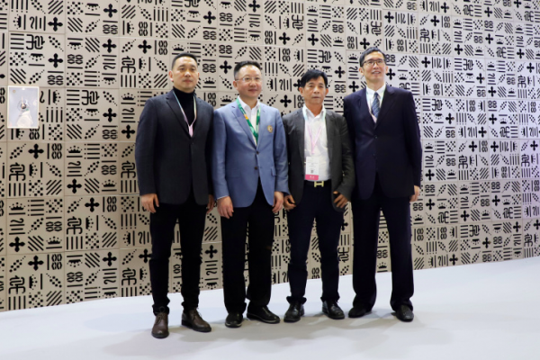 (左起:蘭帛家居總經(jīng)理胡亞軍,中國家用紡織品行業(yè)協(xié)會會長楊兆華先生,柳撟集團董事長傅妙奎,三星羽絨董事長朱志良)