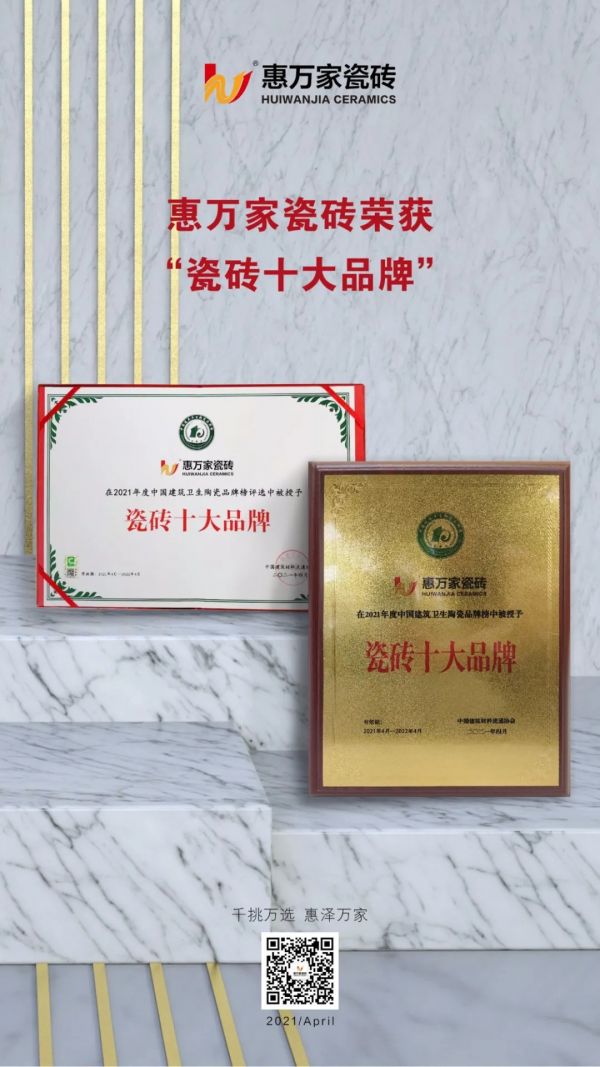 惠萬家瓷磚憑借18年匠心智造和專業服務,在各大品牌中脫穎而出,榮獲 “瓷磚十大品牌”榮譽稱號,充分體現了行業及消費者對惠萬家陶瓷品牌實力的肯定。