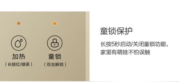 購買高效能的家居產品,可以優化我們的生活,但是如果安全性與健康性得不到保障,前期有多方便,也彌補不了后期的后悔。美的YR1808S-X茶吧機,壺內采用安全健康的304不銹鋼,一體成型清潔方便,耐腐不銹;外層隔熱PP塑料材質,拉絲設計手感細膩,微保溫又防燙;日常生活,怕寶寶接觸產品有危險?為了防止寶寶誤觸機器導致意外燒水燙傷,美的YR1808S-X茶吧機設置長按開關一鍵童鎖功能,每次雙擊即可上鎖,5s內無任何操作直接上鎖,產品使用更安心。