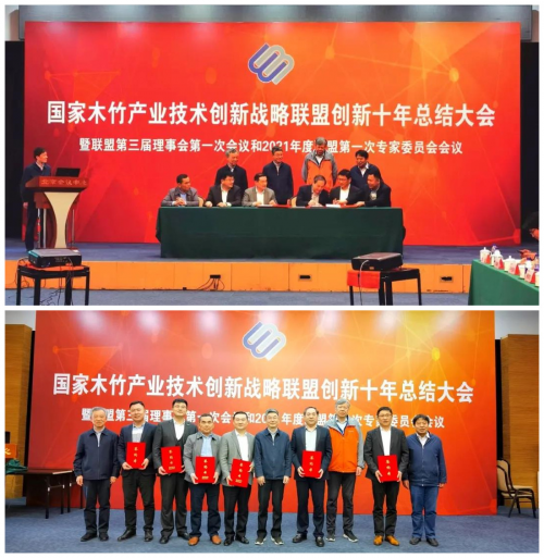 2021年4月17日,國家木竹產業技術創新戰略聯盟(以下簡稱“聯盟”)創新十年總結大會暨聯盟第三屆理事會第一次會議在北京會議中心隆重召開。國家林草局科技司、中國林科院領導、全體理事、聯盟特派員、特邀專家以及聯盟理秘書處成員140多人參會,千年舟新材科技集團股份有限公司研究院院長劉昊博士、知識產權辦公室主任郝玉東高級工程師、研究院材料研究中心研發工程師、聯盟碩士班學員李榕一同與會。