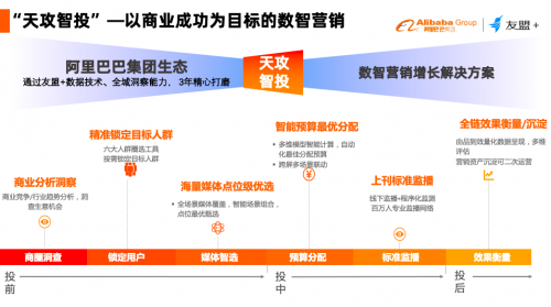 經過長期的市場調研和行業分析,友盟+打造出了一套讓百貨行業品效最大化的營銷解決方案“天攻智投”,這是阿里巴巴的強大技術能力與友盟+豐富客群標簽強強聯合產出的戶外智能營銷平臺,最早應用于阿里巴巴內部的零售體系。天攻智投具備的六大營銷能力: