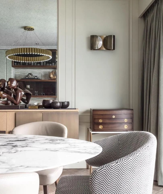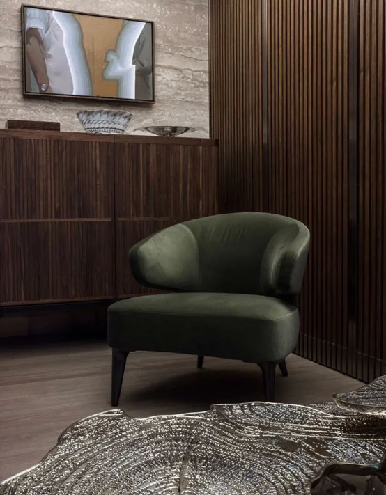 室內空間以素雅的灰綠色為主色調,配合沉穩(wěn)的原木色及金屬裝飾,營造優(yōu)雅的起居空間。開放式廚房及餐廳區(qū)域在木材料及金屬裝飾中更多的融入自然紋理的石材元素,營造更富有質感和層次的空間。