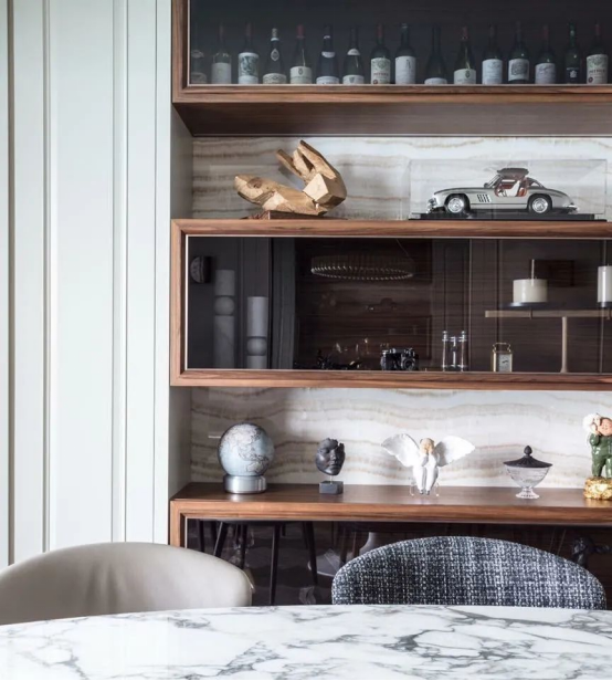屋主喜歡收集藝術品,室內設計中同時結合屋主的不同收藏品類型,及空間氣質在不同的區(qū)域設置展示區(qū)域, 為室內空間增添個人色彩。
