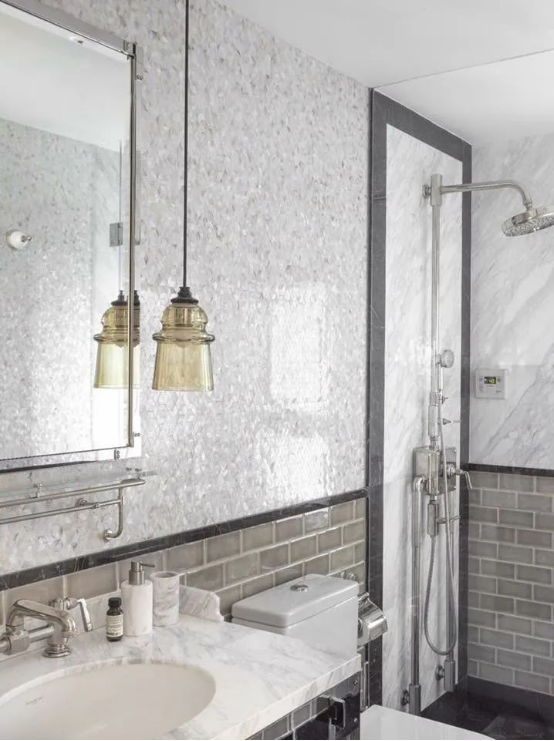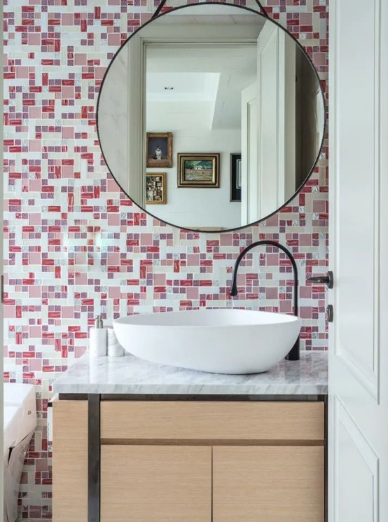 主客衛(wèi)生間中的馬賽克背景墻,構成強烈的視覺元素,沉穩(wěn)的氣息中不乏華麗的點綴。