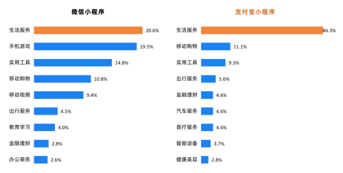 同時,從整體大盤數(shù)據(jù)來看,小程序從出現(xiàn)到現(xiàn)在的五年時間,不僅是生活服務(wù),它整個觸達的行業(yè)范圍非常廣,行業(yè)分布有300多個,遠比App觸達的行業(yè)多。目前小程序最大的兩個平臺,主要是微信和支付寶。