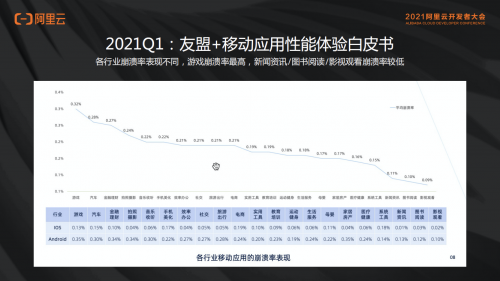 李成亮表示,目前大部分的App應用,在穩定性上做的還遠遠不夠。前不久,友盟+發布了《2021Q1,友盟+移動應用性能體驗白皮書》。根據白皮書數據,移動應用整體的崩潰率是0.29%。但是,李成亮認為,一個應用的崩潰率達到千分之一才是及格的水平,目前大部分應用在降低崩潰率的道路上仍然道阻且長。
