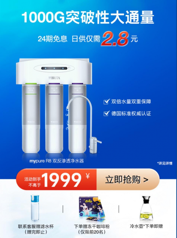 原價(jià)碧然德mypure R8櫥下凈水器618直降1700,參考到手價(jià):1999。